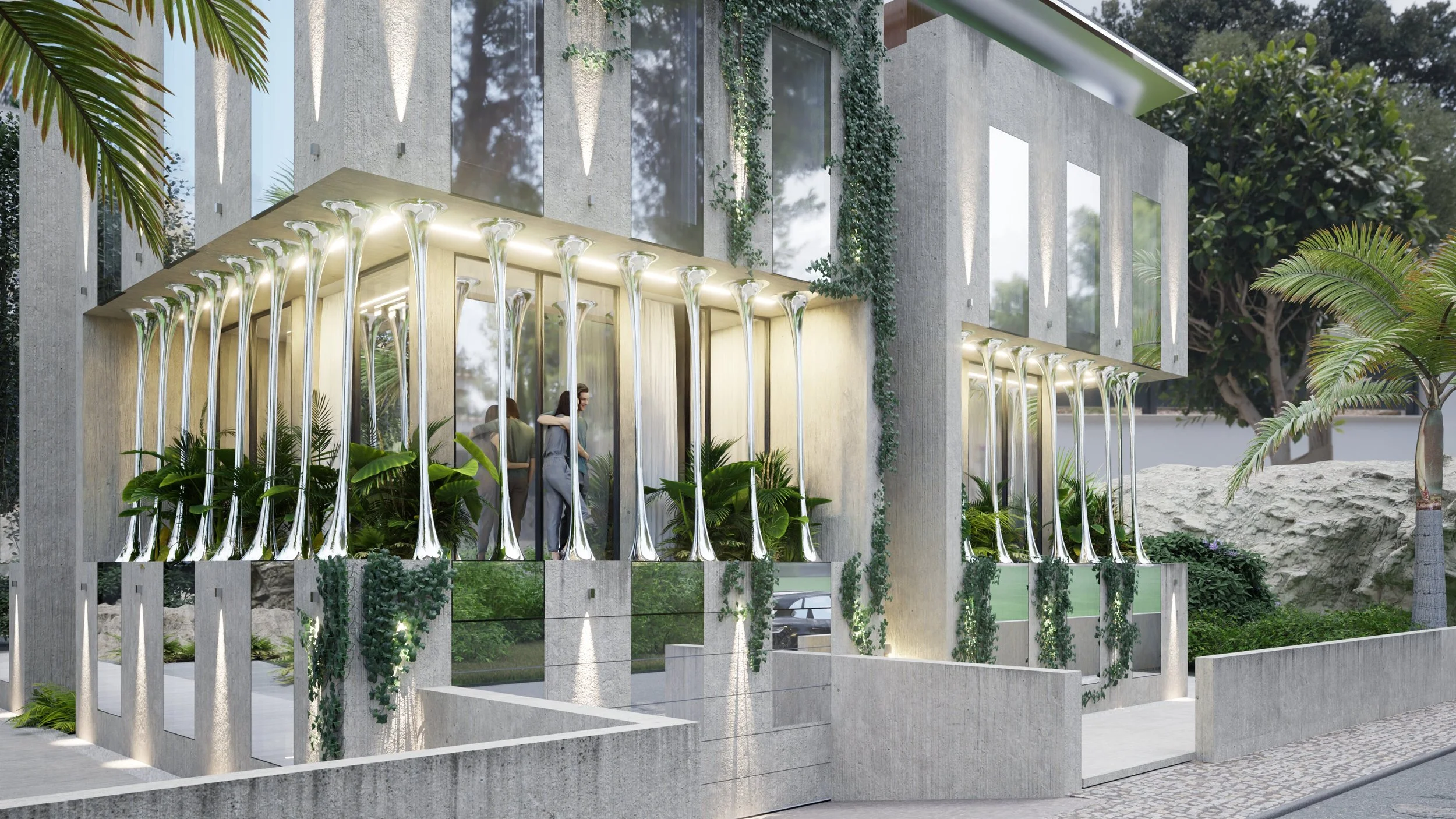 The metal columns contain freon pipes, which cool the columns in hot weather, thereby touching these columns we get that pleasant coolness, and this feeling takes us back to childhood where we communicated with the trees this way. This technology also works for collecting water, when it is hot, the columns begin to condense and drops water flow into the drain and end up in water collection tank, after filtering the water it can be reused. On the hot day you can collect up to 70-80 liters from all columns.